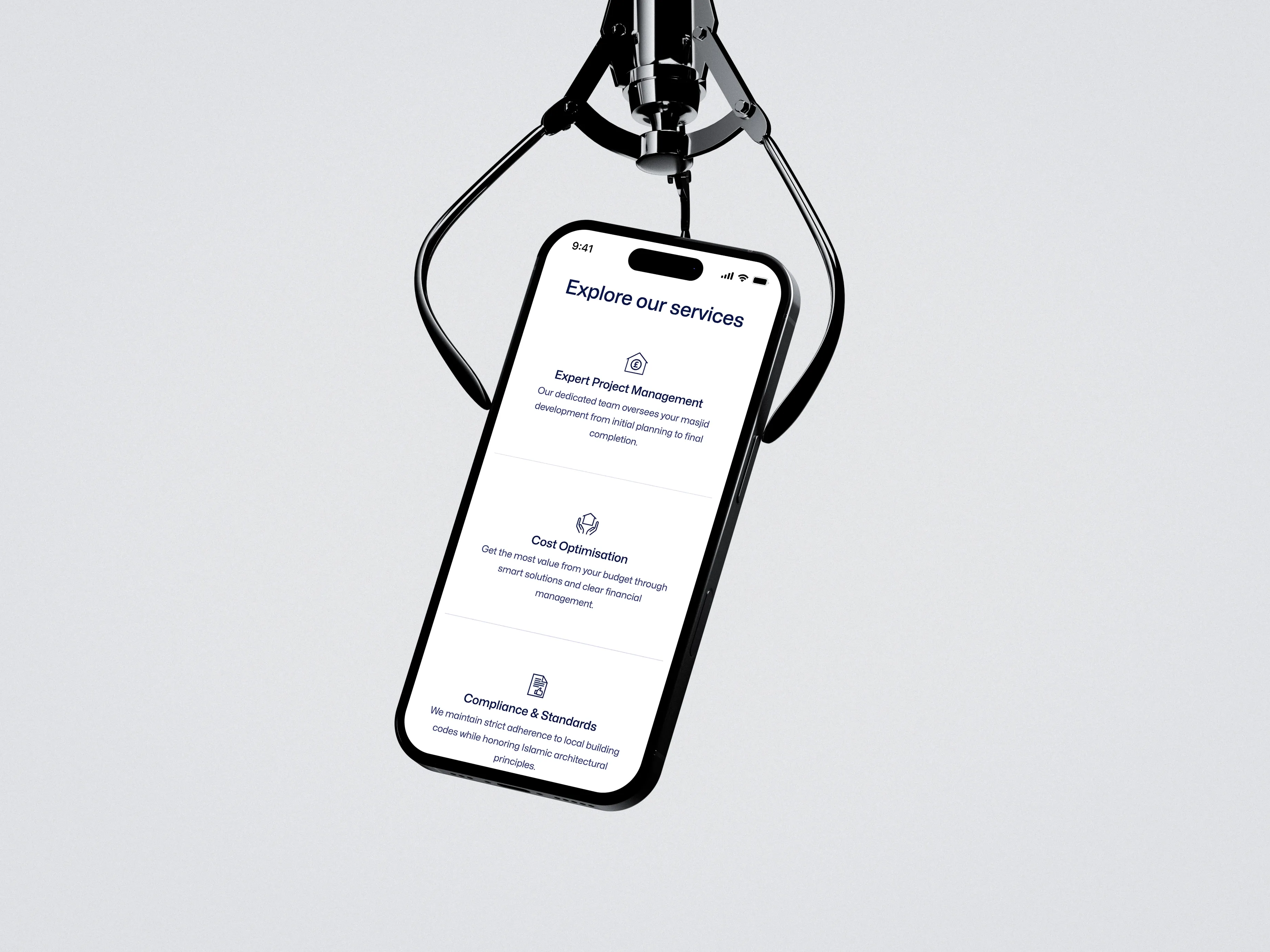 A landing site for a niche development consultancy — helping UK Muslim communities navigate masjid construction and renovation. Clear services, social proof, and a simple contact flow.